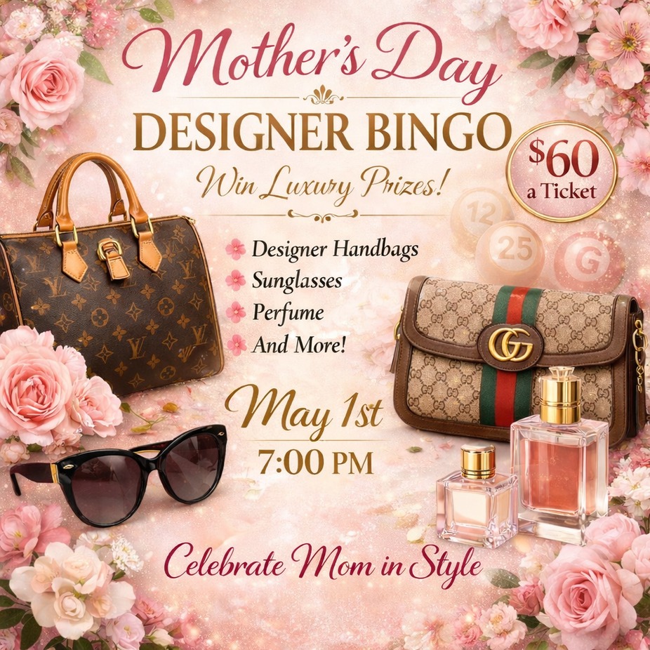 Celebrate Mother’s Day in style at our Designer Bingo Night on May 8th at 7PM! Gather your girls, bring your mom, and enjoy an unforgettable evening filled with fashion, fun, and fabulous prizes.