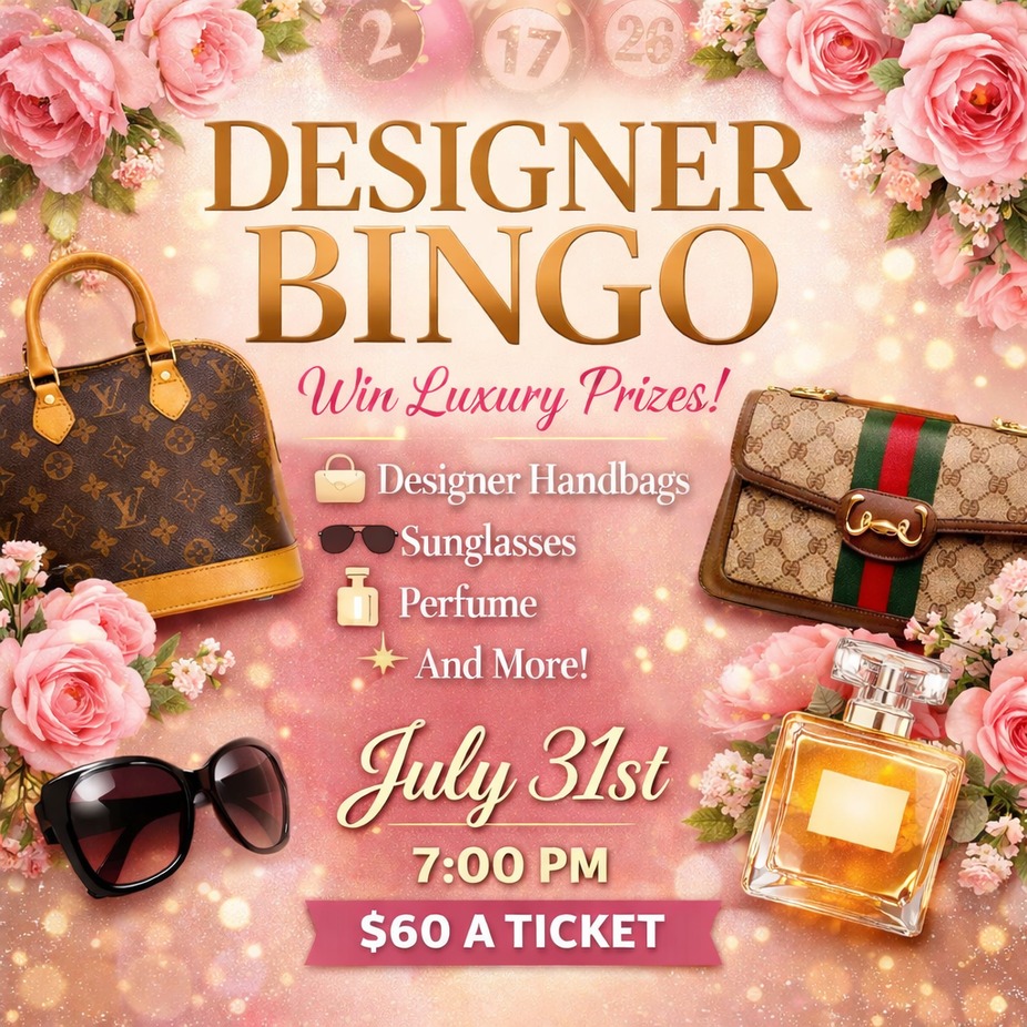 Get ready for a glamorous night of fun, fashion, and fabulous prizes! Join us on July 31 at 7 PM for Designer Bingo, where every round gives you the chance to win luxury items from the world’s top designers. From Louis Vuitton to Gucci and more, each game brings high-end prizes you won’t want to miss.