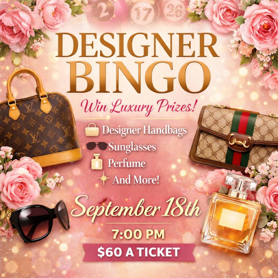 Get ready for a glamorous night of fun, fashion, and fabulous prizes! Join us on Sept 18 at 7 PM for Designer Bingo, where every round gives you the chance to win luxury items from the world’s top designers. From Louis Vuitton to Gucci and more, each game brings high-end prizes you won’t want to miss.