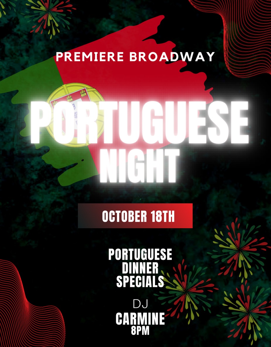 🇵🇹 Portuguese Night at Premiere on Broadway 🇵🇹 Join us for an unforgettable evening celebrating Portuguese culture, flavors, and music at Premiere on Broadway! Enjoy high-energy beats and classic favorites spun by DJ Carmine, along with special musical guests bringing the vibrant sounds of Portugal to life. Indulge in your favorite Portuguese dinner and dessert specials, featuring traditional dishes and sweet treats. Reservations required. Checks can only be split 3 ways per table. ✨ Great music ✨ Authentic Portuguese flavors ✨ Lively atmosphere & good vibes Come eat, dance, and celebrate—Portuguese style—right here on Broadway!